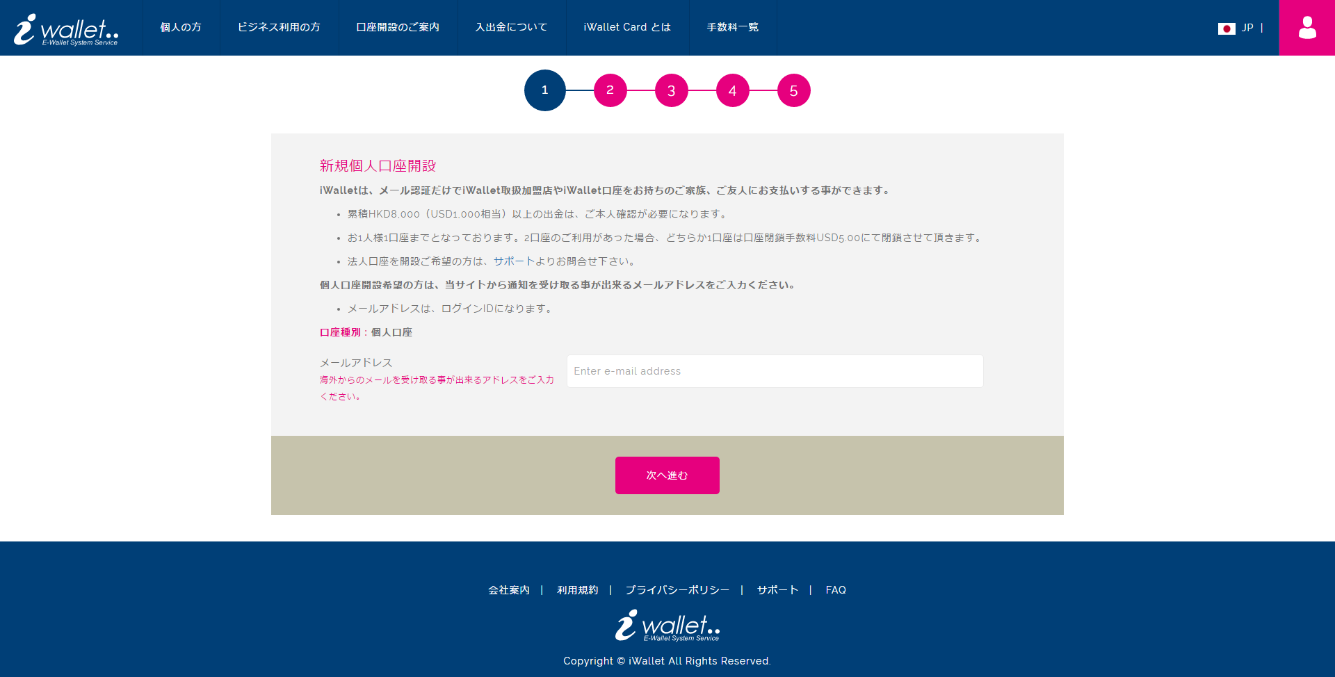 1. 開設フォームで個人、法人を選択してメールアドレスを入力し、「次へ進む」をクリックします。