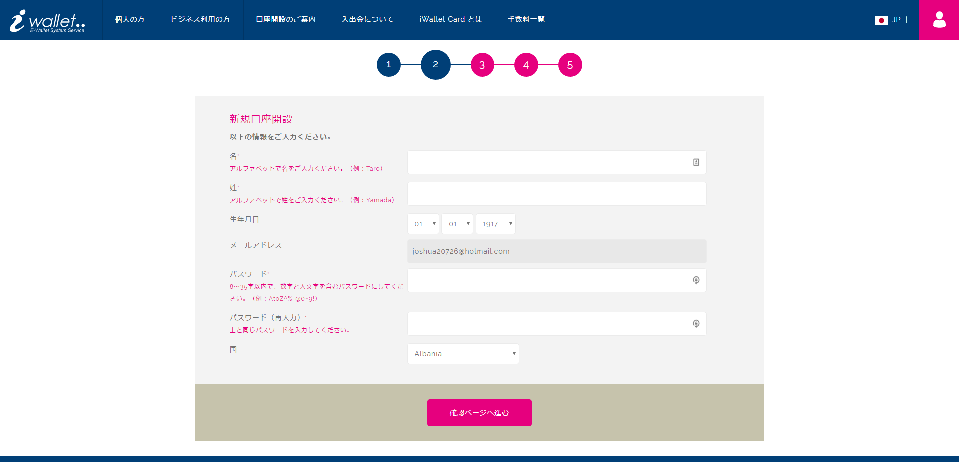 2. パスワード、お名前、居住国名、生年月日をご入力頂いて申請すると、ご登録のメールアドレスに認証メールが届きます。